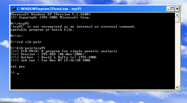 davidD@moonboom:~$ cd Example1 davidD@moonboom:~$ sib-pair |||| SIB-PAIR: A program for simple genetic analysis |\/| Version : F95-DEV (06-Jan-2007) |/\| Author : David L Duffy (c) 1995-2007 |||| Job run : Sat Jan 6 18:50:39 2007 >> |
