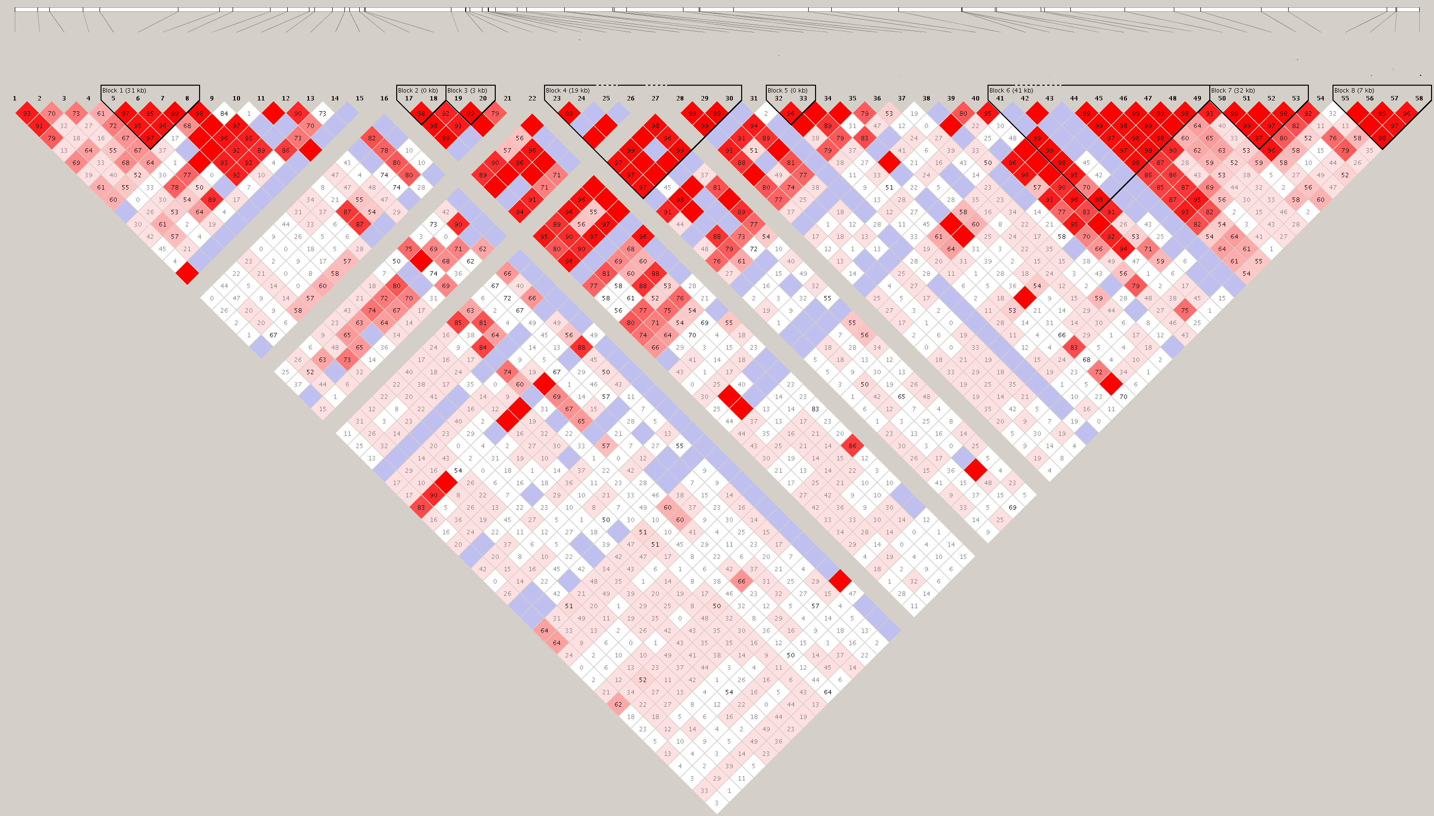 To obtain a nice graphical representation, we can turn to another program Haploview. Here is the Haploview plot of LD across these SNPs. If we are happy looking at a matrix of disequilibrium coefficients, we can: