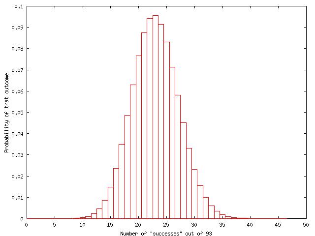 We set p=23/93. Then the probabilities of each possible count out of 93 can be calculated