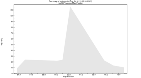>> include cavanaughex.in >> apm ibd >> summary Test: "apm ibd". Total number of tests = 8 Locus Position P-value -log10(P) -------------- --------- ------- ---------- D16S411 62.23 5e-12 11.286 48294236 (chr 16) D16S409 61.00 0.0027 2.571 47333369 (chr 16) D16S753 60.12 0.0027 2.562 31181005 (chr 16) D16S3145 55.01 0.0036 2.446 26784604 (chr 16) D16S419 67.69 0.0082 2.087 51510863 (chr 16) >> summary 10 Locus Position P-value -log10(P) -------------- ---------- ------- ---------- D16S411 62.23 5e-12 11.286 48294236 (chr 16) D16S409 61.00 0.0027 2.571 47333369 (chr 16) D16S753 60.12 0.0027 2.562 31181005 (chr 16) D16S3145 55.01 0.0036 2.446 26784604 (chr 16) D16S419 67.69 0.0082 2.087 51510863 (chr 16) D16S415 69.15 0.0483 1.316 52228236 (chr 16) D16S771 70.85 0.1120 0.951 53066505 (chr 16) D16S769 53.71 0.1297 0.887 26066263 (chr 16) >> summary tab Bin Count Percent ------- ----- ------- 10^-11 1 12.5 10^-8 0 0.0 10^-7 0 0.0 10^-6 0 0.0 10^-5 0 0.0 10^-4 0 0.0 10^-3 0 0.0 10^-2 4 50.0 10^-1 1 12.5 10^0 2 25.0 >> summary plot >> $ gv sib-pair.eps &